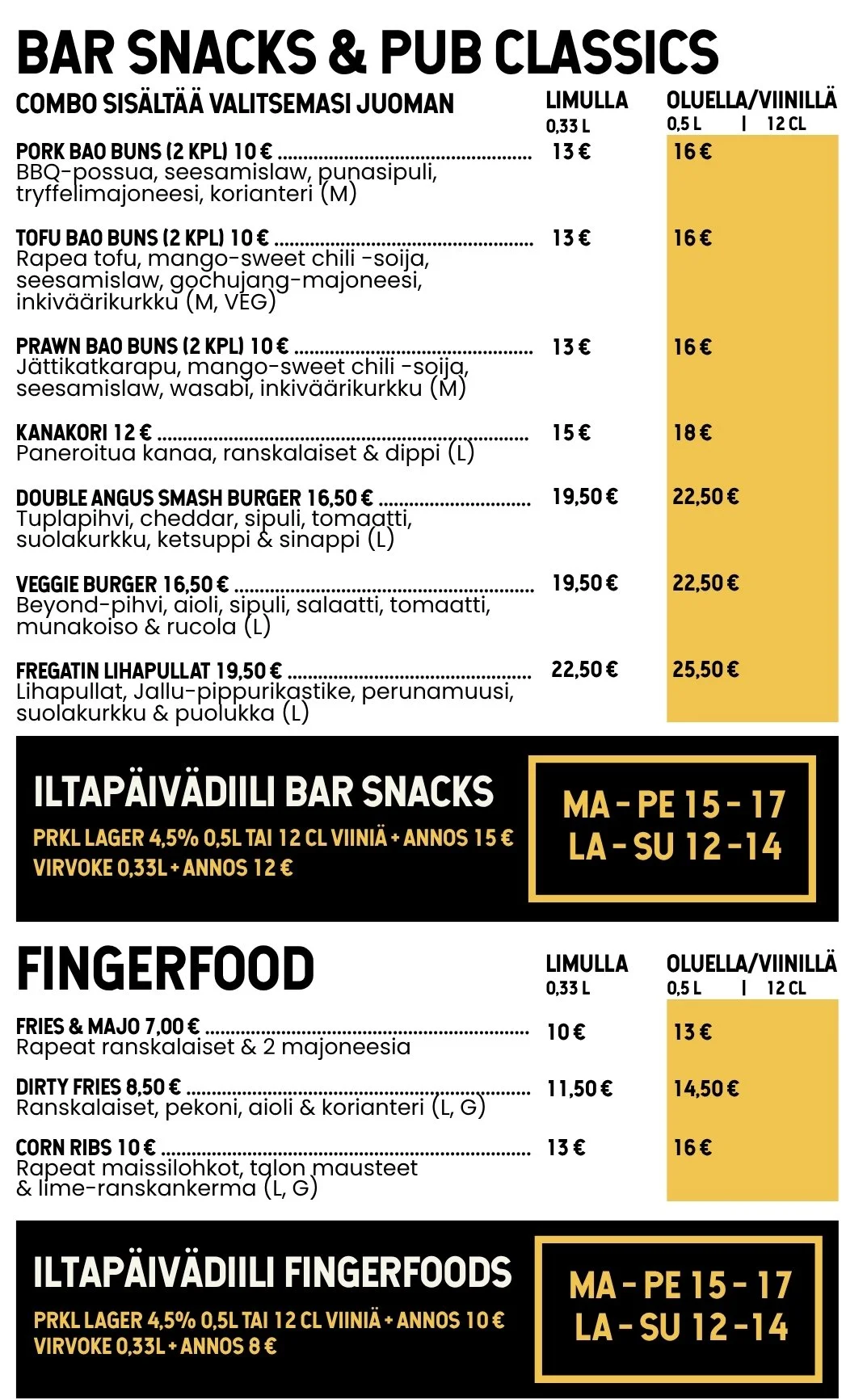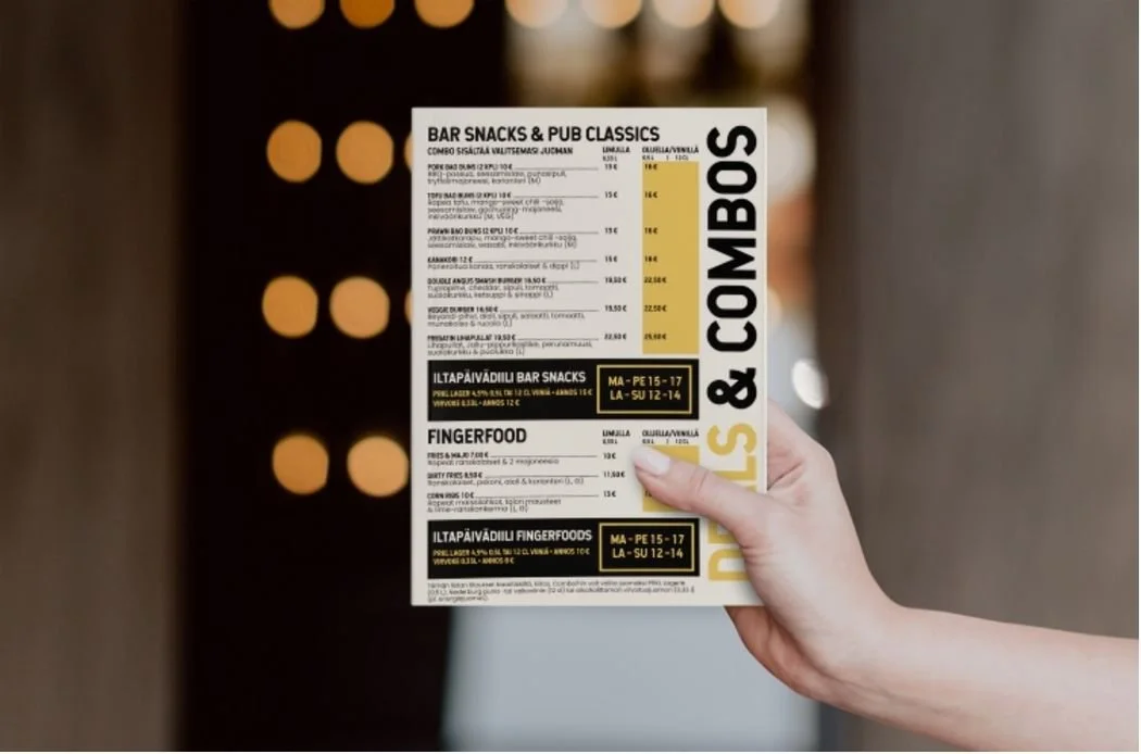 Tämän listan tilaukset baaritiskiltä, kiitos. Comboihin voit valita juomaksi PRKL Lagerin (0,5 L), Nederburg puna- tai valkoviinin (12 cl) tai alkoholittoman virvoitusjuoman (0,33 l), pl. energiajuomat.
